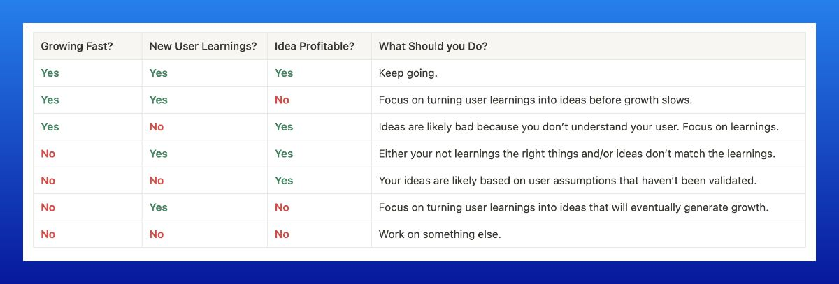 The way to think about this holistically is to remember that user learnings produce ideas and ideas generate growth. If you don't have growth, you need ideas. If you don't have ideas, you need to user learnings. If you don't have user learnings, talk to your users.